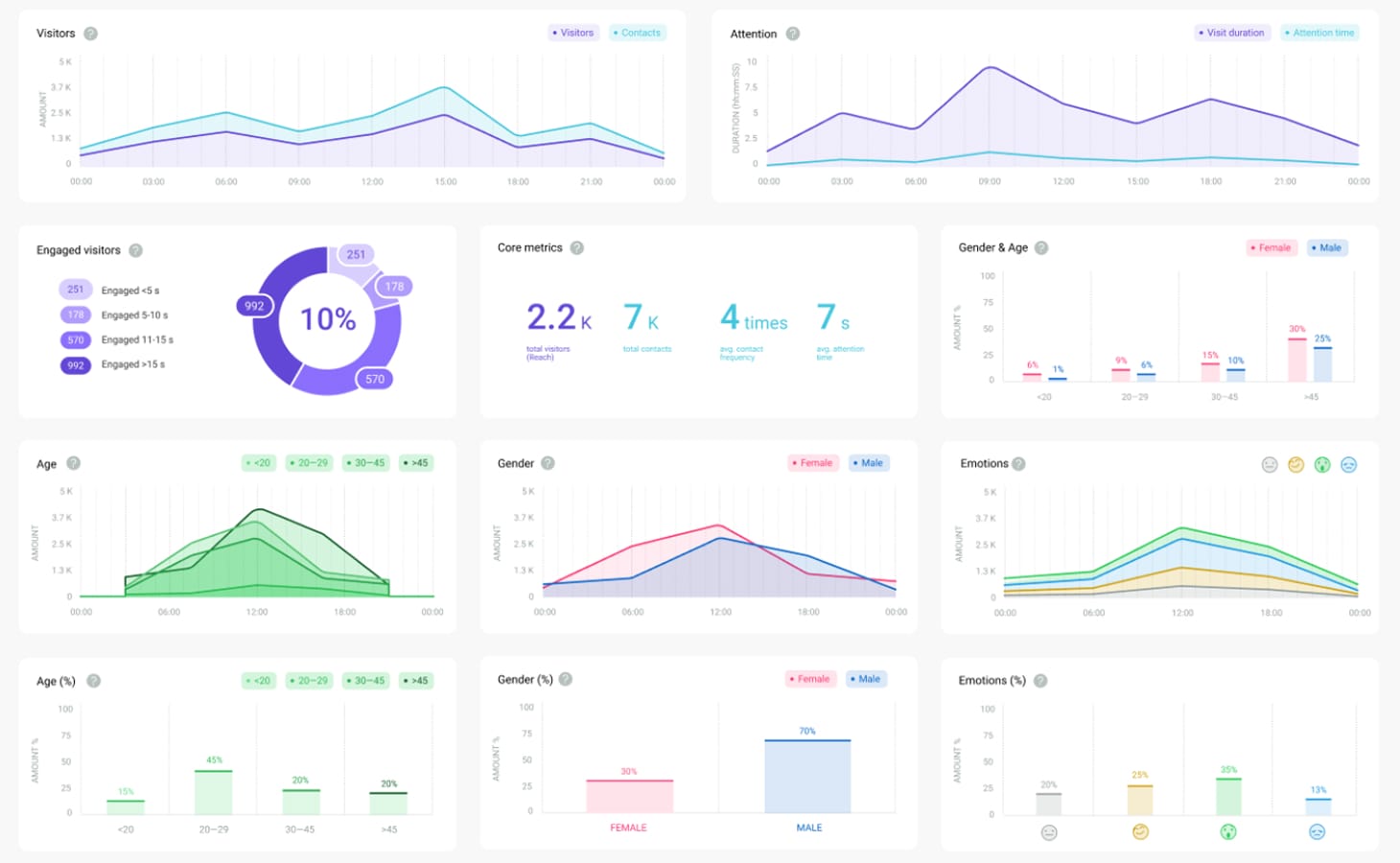 - Cantidad de tráfico, tráfico rebotado, número de clientes potenciales, hora punta, datos demográficos y expresiones faciales.